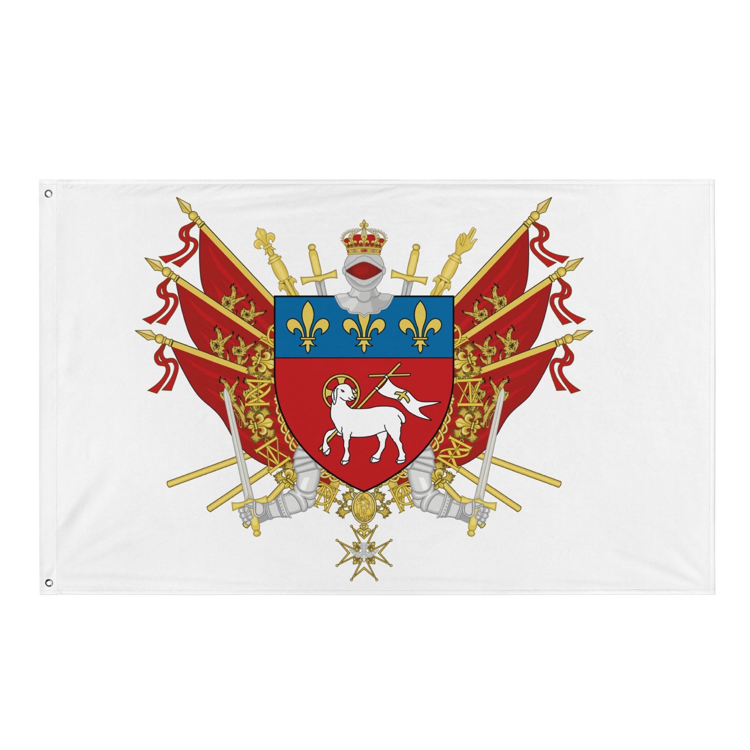 "De gueules à l'Agneau Pascal passant d'argent, nimbé et portant une croix de gueules avec sa bannière d'argent à la croix de gueules ; au chef d'azur semé de fleurs de lys d'or."