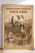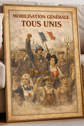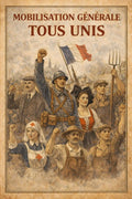 Notre affiche de la mobilisation générale rend hommage à ce moment solennel du 1er août 1914, où toute la nation française s’est levée d’un seul homme pour défendre son territoire et son honneur. Conçue dans l’esprit visuel des campagnes de 14-18, elle incarne l’élan de fermeté patriotique et de solidarité nationale qui marqua le début de la Grande Guerre.