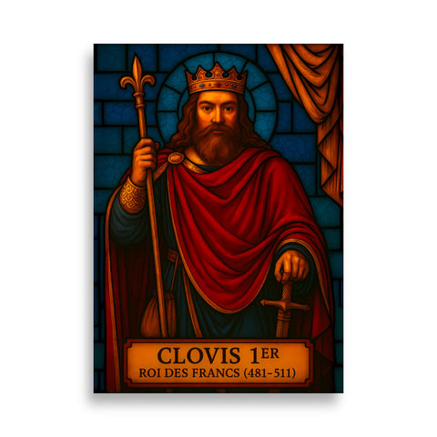 Notre affiche de Clovis Ier rend un vibrant hommage au baptême fondateur de la France, dans un style vitrail sacré qui fait éclater la lumière divine sur le premier roi chrétien des Francs.