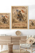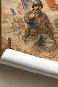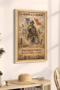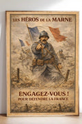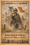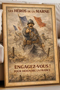 Notre affiche des héros de la Marne rend hommage à ceux qui, en septembre 1914, ont tenu tête à l’envahisseur au prix d’un courage inouï. Inspirée de l’imagerie patriotique de la Grande Guerre, elle célèbre l’endurance, le dévouement et l’esprit de sacrifice des soldats français qui ont changé le cours de l’Histoire lors de la première bataille de la Marne.