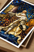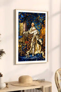Le style inspiré des vitraux d’églises apporte au portrait une dimension solennelle et mémorielle. Il sublime la figure dans une esthétique intemporelle.